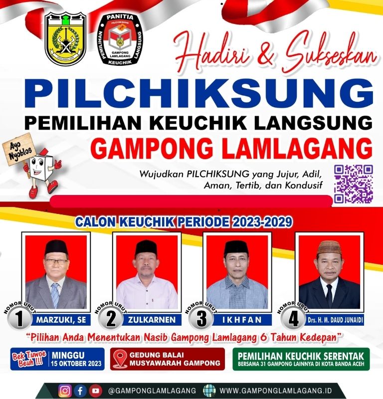 Pastikan Kamu Hadir dalam Pemilihan Keuchik Secara Langsung (PILCHIKSUNG) Serentak bersama 31 Gampong lainnya di Kota Banda Aceh Minggu 15 Oktober 2023 Pukul 08:00-14:00 WIB